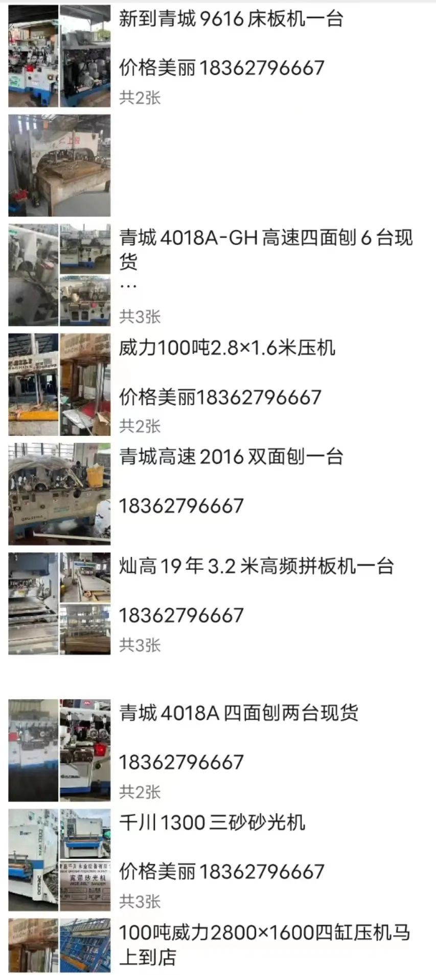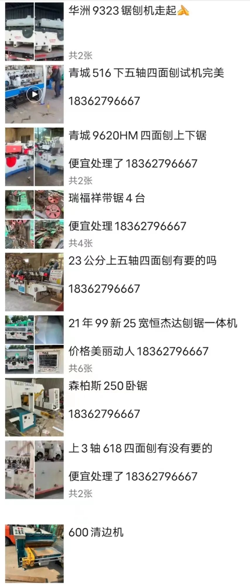 整厂回收 整厂规划 各种品牌二手机械,各种木材成品半成品 木工设备 ,叉车,抱机,带锯,跑车,四面刨,双面刨,多片锯,单片锯,拼板机,高频,烘干窑,压机,砂光机,刨砂机,封边机,电子开料锯,往复锯,断料锯,油漆线,锯刨机,刨锯机,床板机,扣板机,左右锯,推台锯,方木机,原木机,原木多片锯,框锯,卧锯,龙门锯,锯刨一体机,全自动梳齿机,接木机,UV线等各种木工机械 家具机械