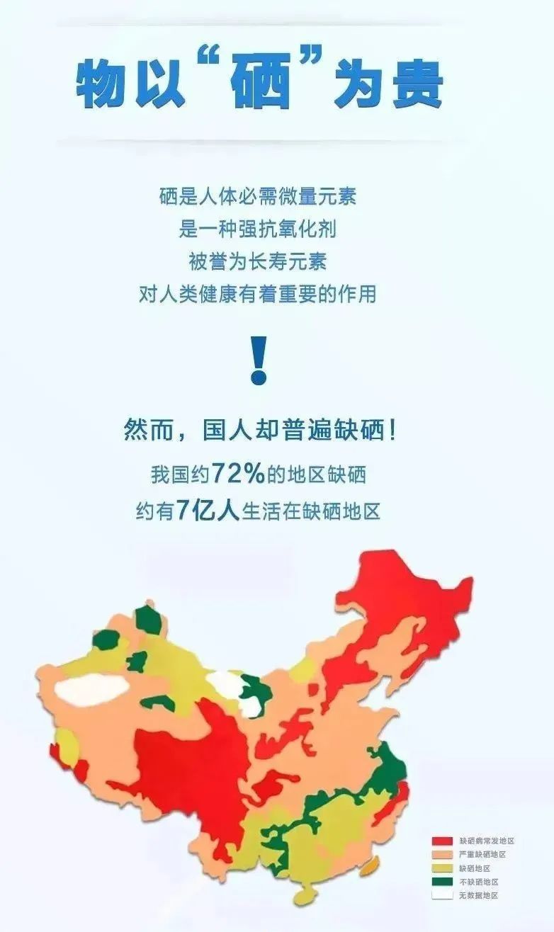 然而,国人却普遍缺硒,我国约72%的地区缺硒,约有7亿人生活在缺硒地区!