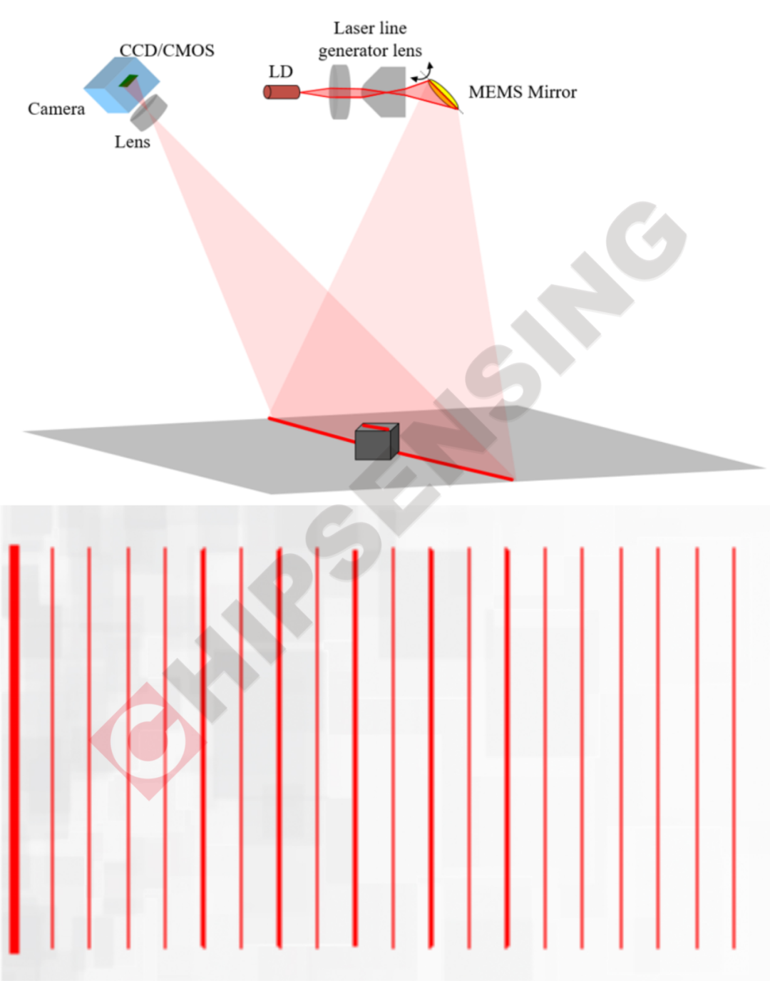 知芯自有投射模组技术,其基本原理是激光通过准直与线性透镜将点光转换成线光投射到MEMS微镜上,MEMS微镜作为转动部件,将线光反射并在投射面形成明暗相间的结构光条纹,单目/双目相机拍摄变形条纹图获取物体三维信息。