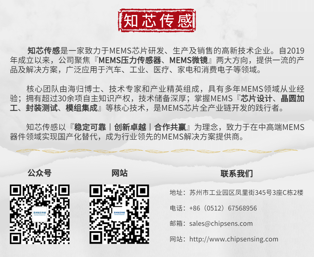 知芯传感是一家致力于MEMS芯片研发、生产及销售的高新技术企业。自2019年成立以来,公司聚焦『MEMS压力传感器、MEMS微镜』两大方向,提供一流的产品及解决方案,广泛应用于汽车、工业、医疗、家电和消费电子等领域。