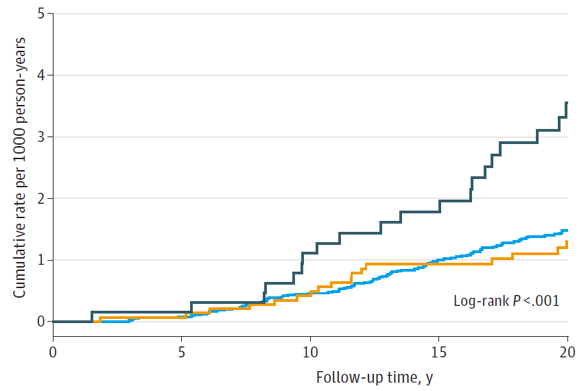 在平均21年的随访期间,共确认了207例新发肝癌病例和148例慢性肝病死亡病例。