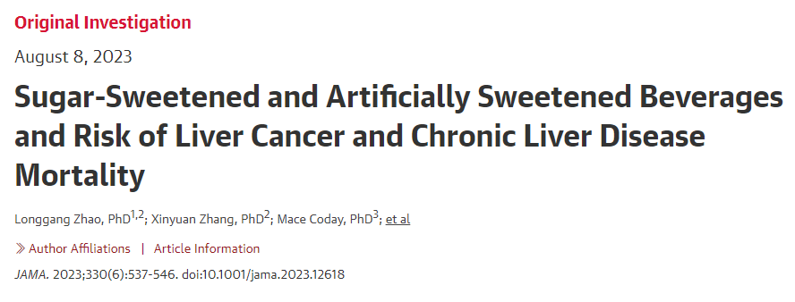 2023年8月8日,美国南卡罗来纳大学、布莱根妇女医院、哈佛医学院的研究人员在《美国医学会杂志》(JAMA)上发表了一篇题为" Sugar-Sweetened and Artificially Sweetened Beverages and Risk of Liver Cancer and Chronic Liver Disease Mortality "的研究论文。