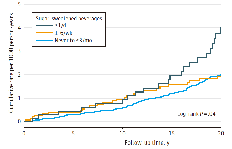 在该研究中,研究人员分析了大型前瞻性研究美国妇女健康倡议(WHI)研究中98786名绝经后女性参与者,年龄在50-79岁之间,通过问卷形式收集了参与者的含糖饮料摄入量,根据摄入量分为3组:从不喝或每月喝少于3杯、每周1-6杯、每天1杯或更多,分析了含糖饮料的摄入与肝癌发生率和慢性肝病死亡率之间的关系。