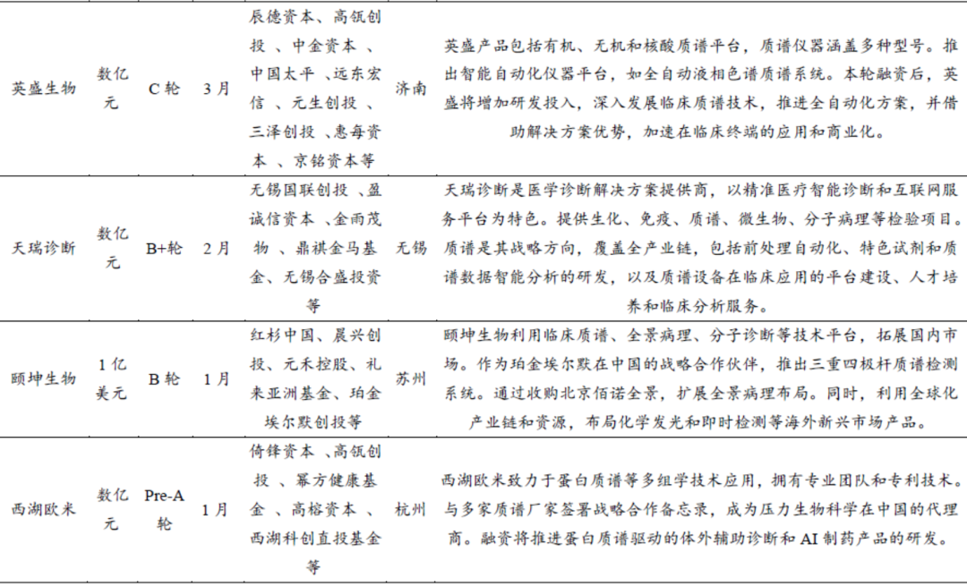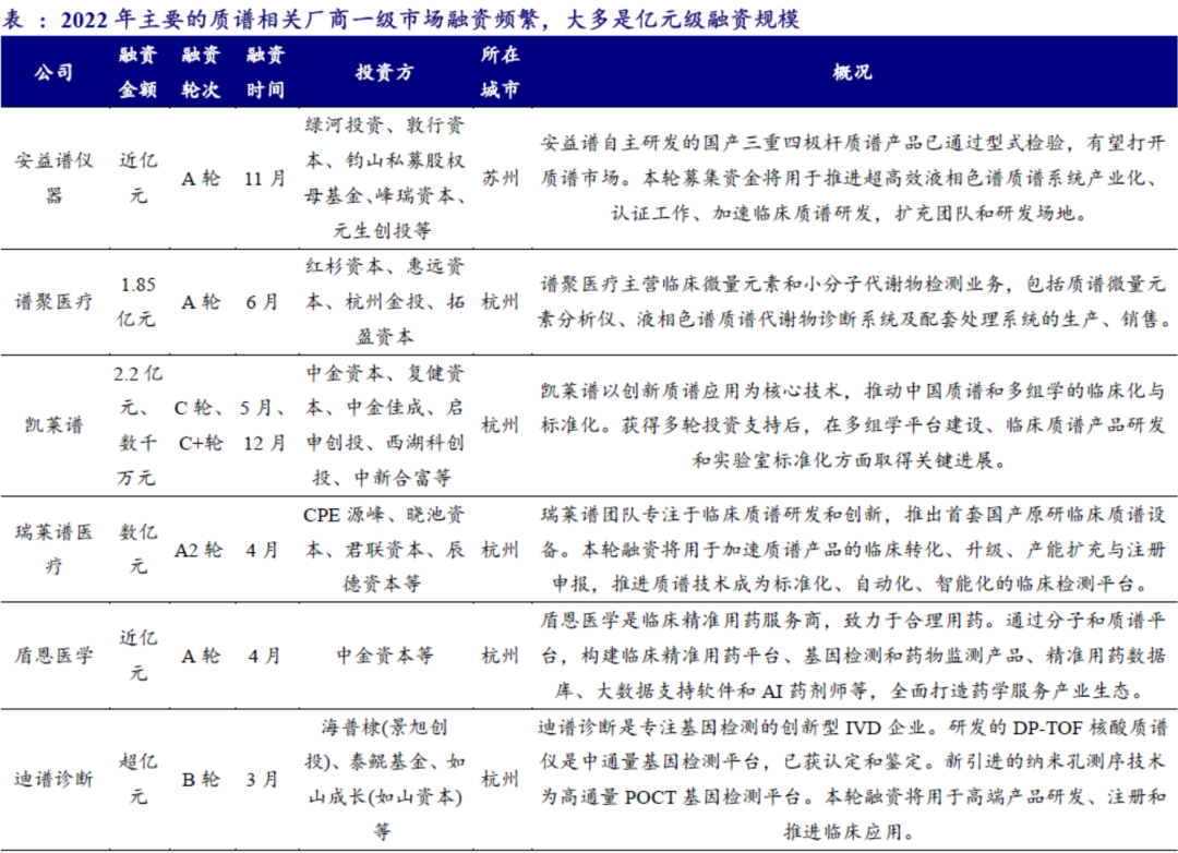 在当下的背景下,政策对临床质谱应用端和仪器端表现出了高度的关注度。同时,由于居民对医疗健康需求的增加以及体外诊断技术的不断升级迭代,临床质谱行业近年来出现了频繁的融资事件。豪思生物、佰辰医疗、凯莱谱和瑞莱谱等公司都成功获得了超过一亿元的融资额。从融资轮次、融资总额以及投资机构等方面来看,临床质谱在资本市场上仍然处于快速上升的阶段,成为当前生命科学领域备受关注的赛道之一。