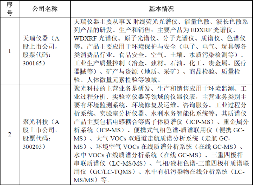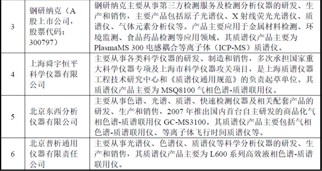 质谱仪产品属于高端分析仪器的一种,国际分析仪器行业巨头主要包括沃特世、丹纳赫、布鲁克、安捷伦、赛默飞、岛津等,其分析仪器种类众多,基本涵盖目前市场常见的各类光谱仪、色谱仪、质谱仪等产品。国内以分析仪器为主营业务的上市公司主要有天瑞仪器、聚光科技、钢研纳克、三德科技等。此外,国内涉及分析仪器研发、生产和销售的非上市公司主要有上海舜宇恒平科学仪器有限公司、北京东西分析仪器有限公司、北京普析通用仪器有限责任公司等。