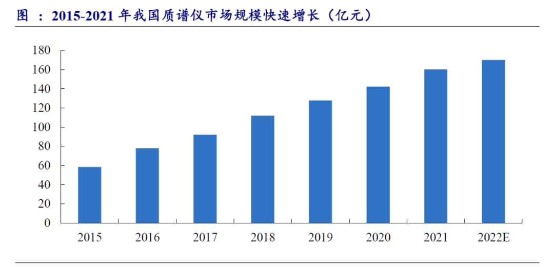 随着质谱分析市场需求的急剧增长,我国质谱仪市场也呈现快速增长态势。数据显示, 2021 年我国质谱仪市场规模160.3 亿元,约占全球市场的30%左右。2022 年预计进一步上升至170 亿元左右。2015 年至2021 年中国质谱仪市场CAGR 达15.49%,高于全球水平,预计未来十年中国质谱仪市场规模仍将不断扩大。