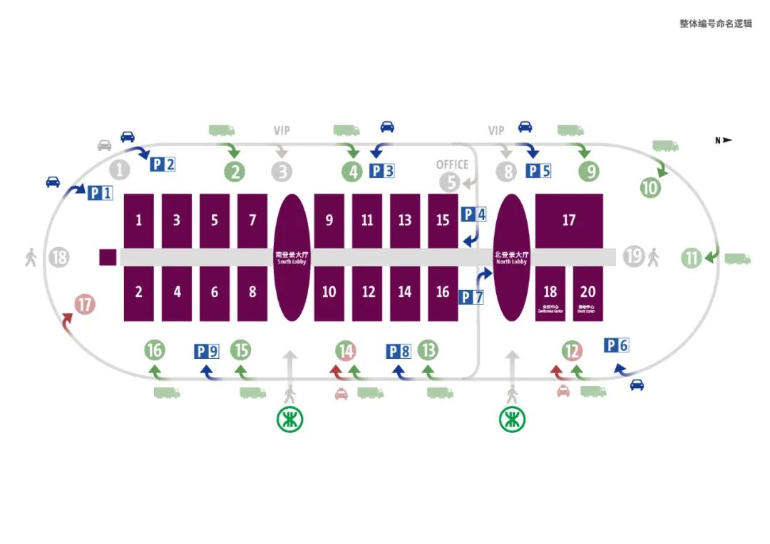 项目外围,城市道路分析、项目出入口分析(人行:会议、参观、布展、撤展;车行:客车、货车)、确定实际车行、人行出入口、命名系统、售票中心、展览服务中心、咨询中心、贵宾服务中心。