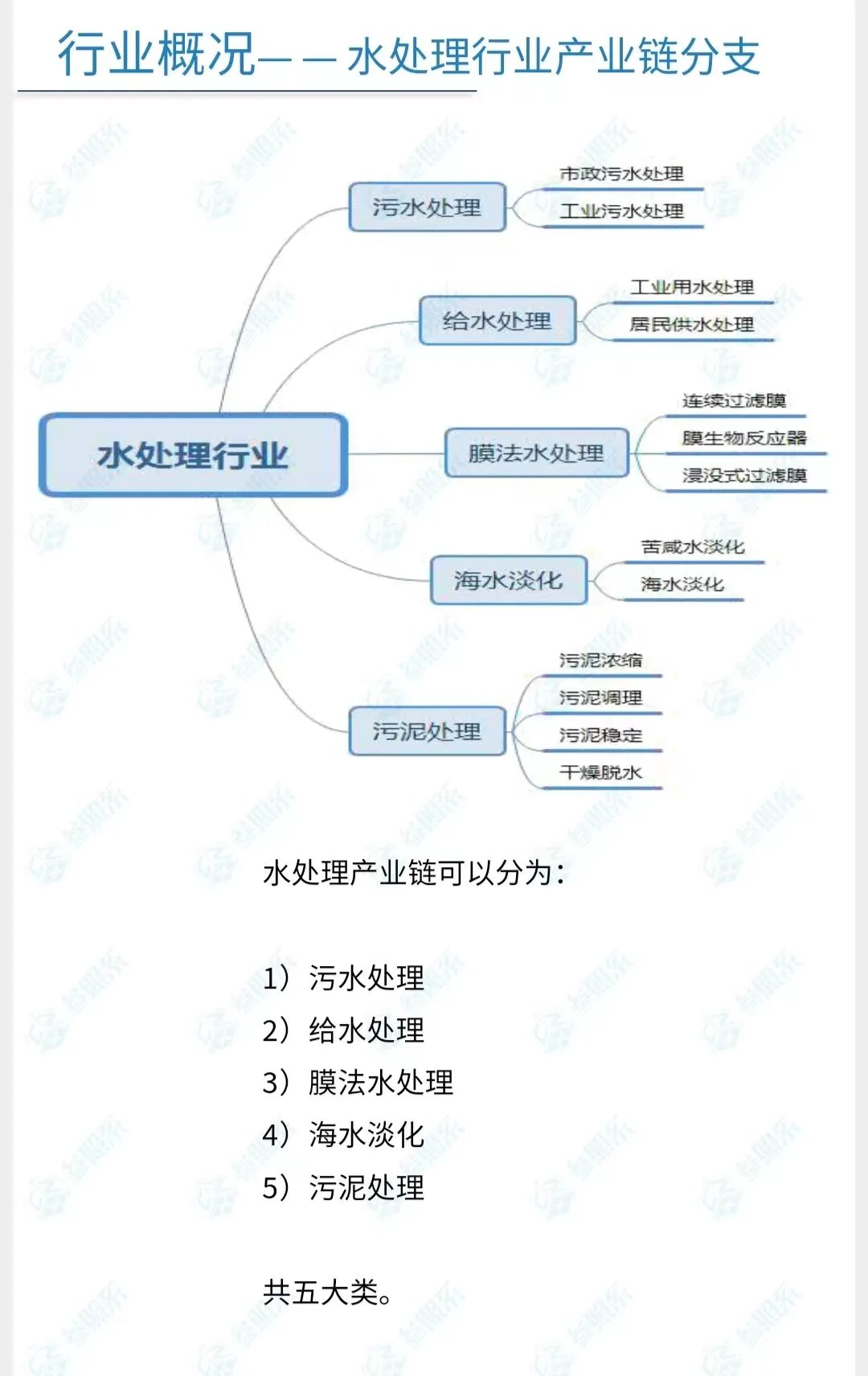 水处理行业是指由原水、供水、节水、排水、污水处理及水资源回收利用等构成的产业链,此外还包括再生水利用、污泥处理等与水处理有关的衍生行业。