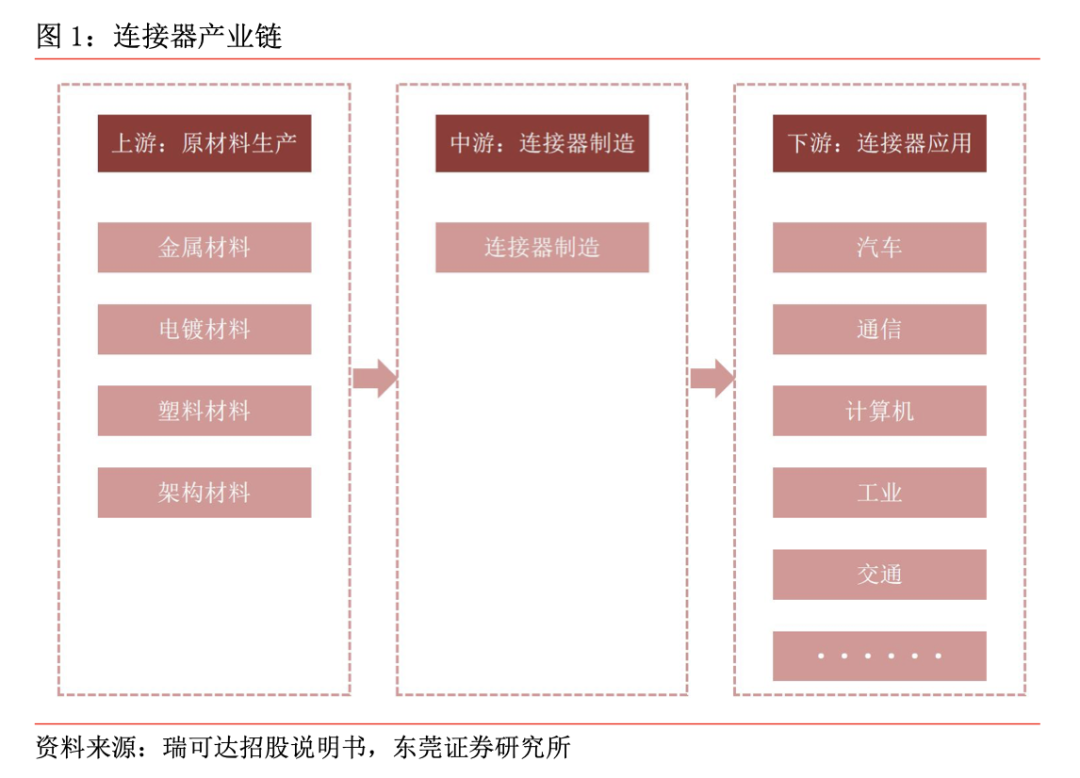 连接器产业链情况:上游为原材料生产,下游涵盖多个应用领域。从产业链角度看,连接器上游为原材料生产,包括金属材料(黄铜、磷铜、不锈钢等)、塑胶材料(PVC塑胶粒、LCP 塑胶粒、高温塑胶粒等)、电镀材料和架构材料等,以及机械加工设备、电镀加工设备、测试设备和装配设备等设备供应商,中游为连接器的设计与制造,下游为电子产品品牌商及其直接面对的终端消费者,涵盖汽车、通信、计算机、工业级交通等多个应用领域。