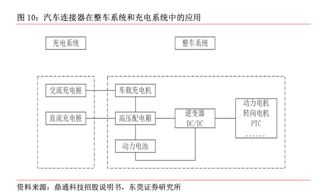 汽车电动化增加对高压连接器需求。传统燃油车采用内燃机驱动,工作电压一般为14V,多用于传统燃油车的 BMS、空调系统和车灯等。与传统燃油车不同,新能源汽车采用电力驱动电机的原理,核心部件在电池、电机、电控的三电系统,为达到较大扭矩和扭力,需提供大功率的驱动能量,需要相应的高电压和大电流,增加对高压连接器的需求。高电流、高电压的电驱系统对连接器的可靠性、体积和电气性能剔除更高的要求,这意味着新能源汽车对连接器产品的需求量及质量要求都将大幅提高。根据鼎通科技招股说明书,传统燃油汽车单车使用低压连接器价值在 1,000 元左右,而高压连接器的材料成本以及屏蔽、阻燃要求等性能指标高于传统的低压连接器,新能源汽车单车使用连接器价值远高于低压连接器。其中,纯电动乘用车单车使用连接器价值区间为3,000-5,000元,纯电动商用车单车使用连接器价值区间为 8,000-10,000 元。