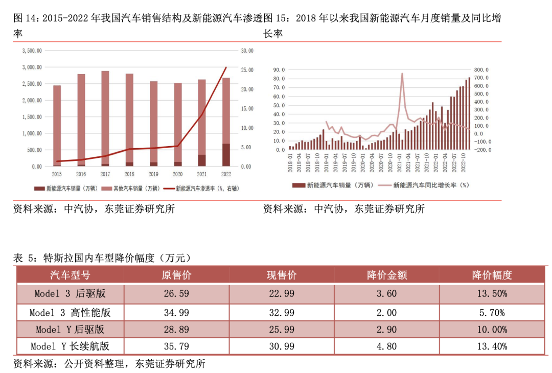 我国汽车销量陷于停滞,但新能源汽车渗透率仍在持续提升。近年来,新能源汽车在动力性能、充电速度和续航里程等方面进步明显,市场竞争力显著增强,在政策与市场的双重驱动下,成为汽车行业发展的重要方向。虽然我国汽车销量自2017 年以来进入存量市场,但以电动汽车为代表的新能源汽车销量持续增长,且渗透率不断提升。据中汽协,2021 年我国新能源汽车销售总量为 350.7 万辆,同比+165.11%,进入加速渗透期;2022 年我国新能源汽车销售总量为 687.2 万辆,同比+95.95%,占同期汽车销售总量的25.59%。中汽协预计,2023 年我国新能源汽车销量有望超过900 万辆,渗透率进一步提升。伴随着规模效应下生产成本下降、电池技术进步带来的续航里程提高,以及充电桩等基础设施逐步完善,国内新能源汽车有望从政策导向转向需求导向,而特斯拉2023年 1 月引领的新能源车大幅降价也有望加速汽车电动化的进一步推广,利好汽车高压连接器的量价齐升。