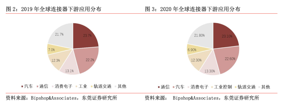 连接器下游应用广泛,汽车与汽车连接器是最主要的应用场景。从连接器下游应用领域来看,作为重要的电子元器件产业之一,连接器现已广泛应用于汽车、通信、计算机等消费电子、工业、交通等领域。根据 Bipshop&Associates 数据,汽车连接器2019-2020年占连接器市场规模份额分别为 23.7%和 22.6%,份额分别位列第一和第二,是连接器领域最主要的应用场景之一。