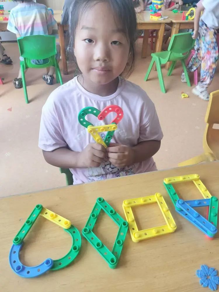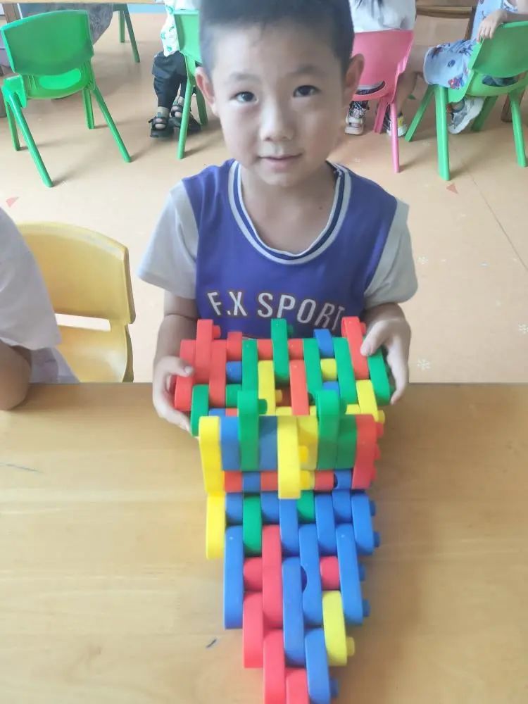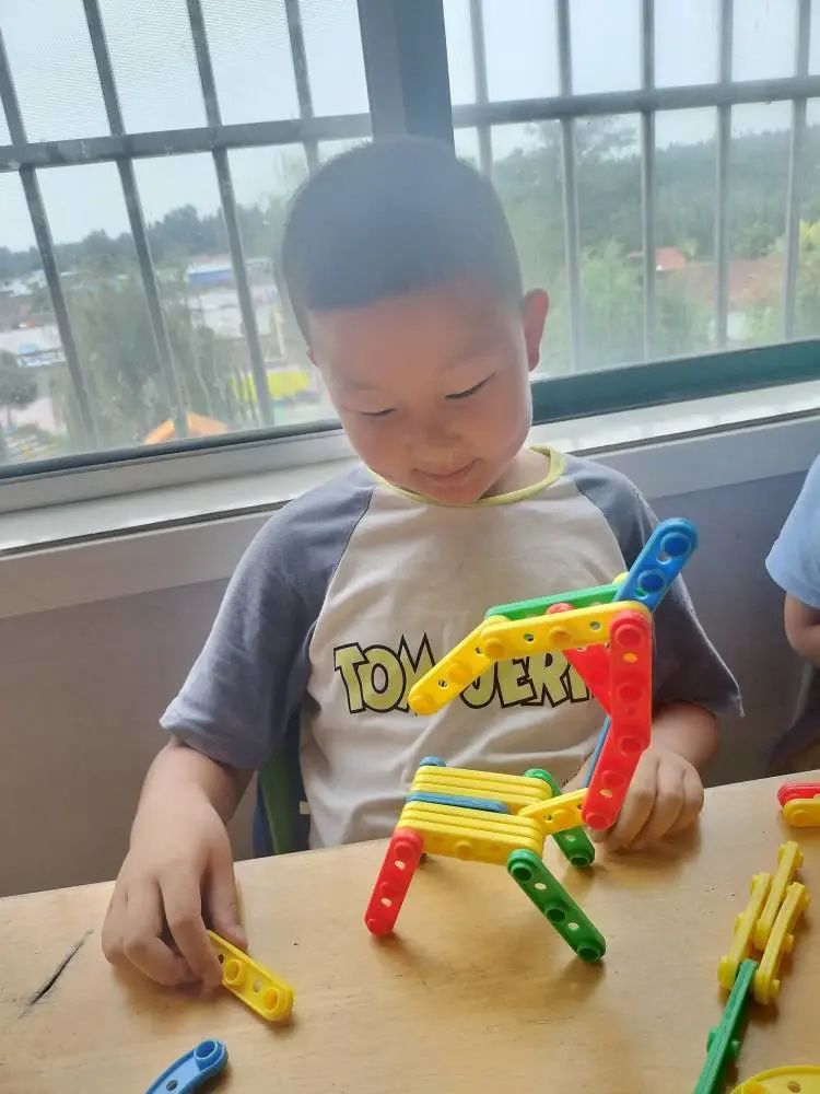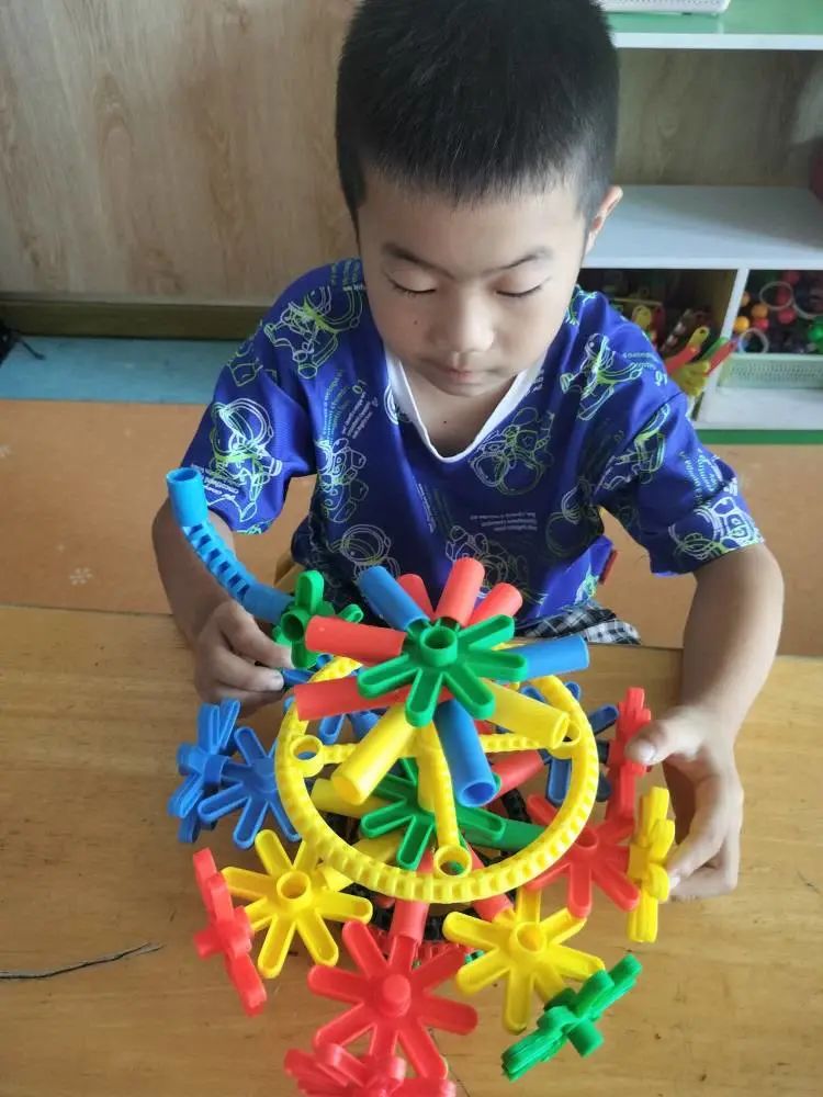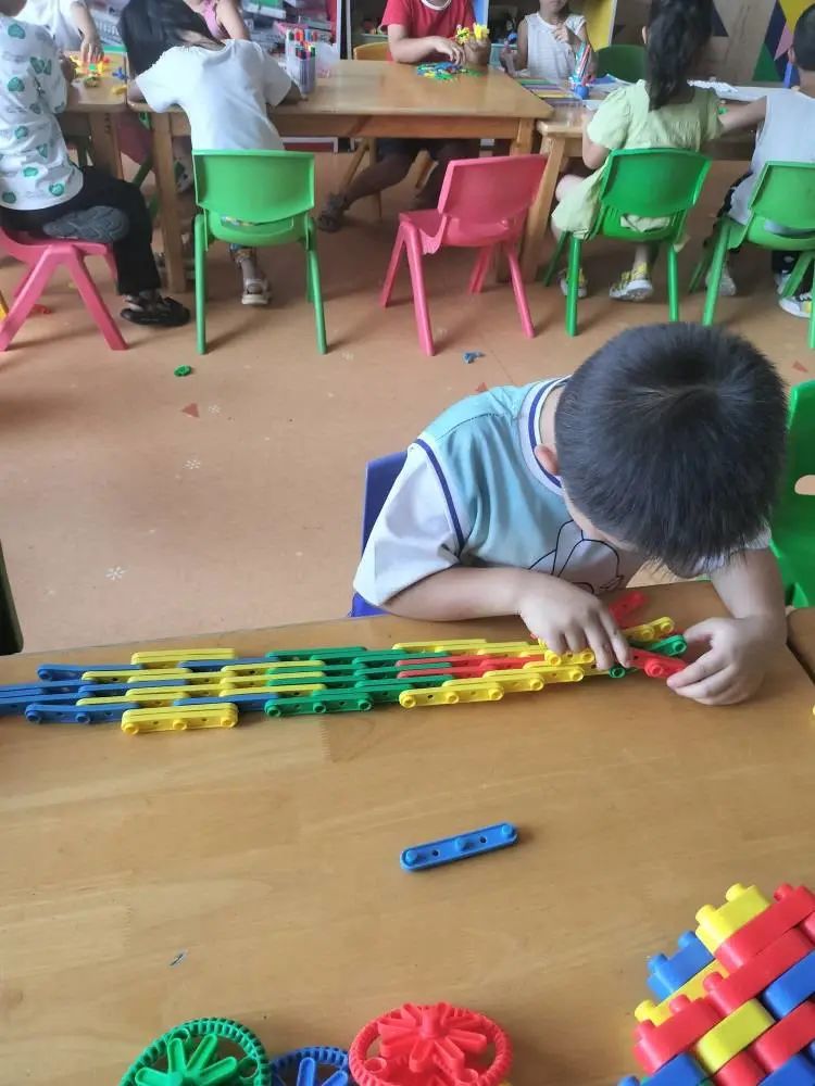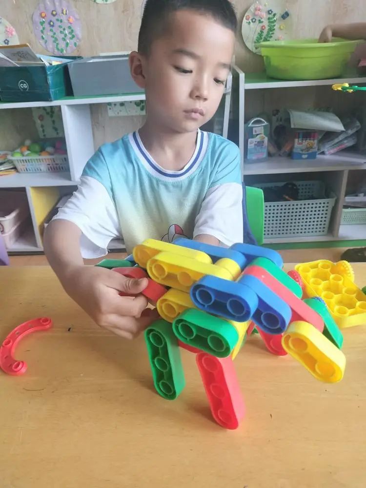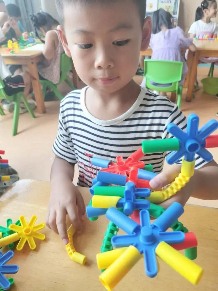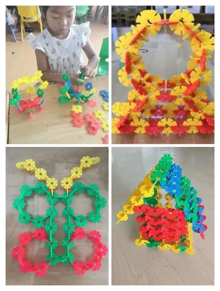 孩子们每天利用自主游戏的时间探索各种拼插技能,从最简单的拼插、连接,到高难度的组合垒高,造型从一开始的平面过渡到立体拼插。