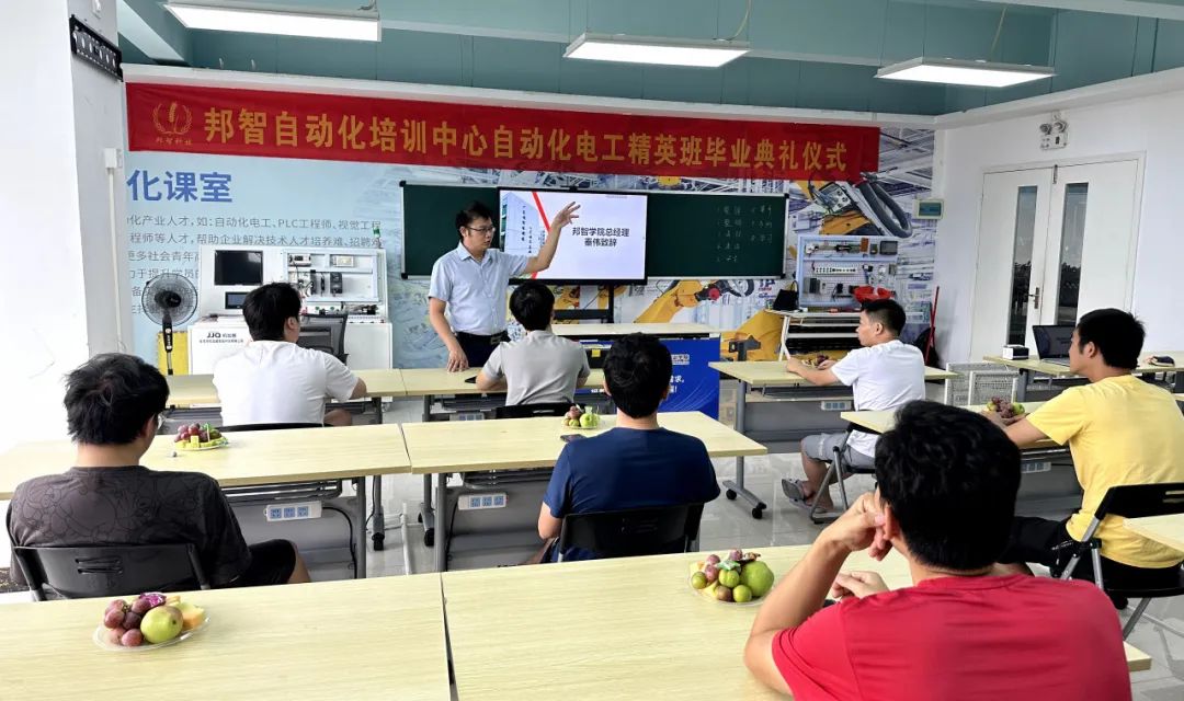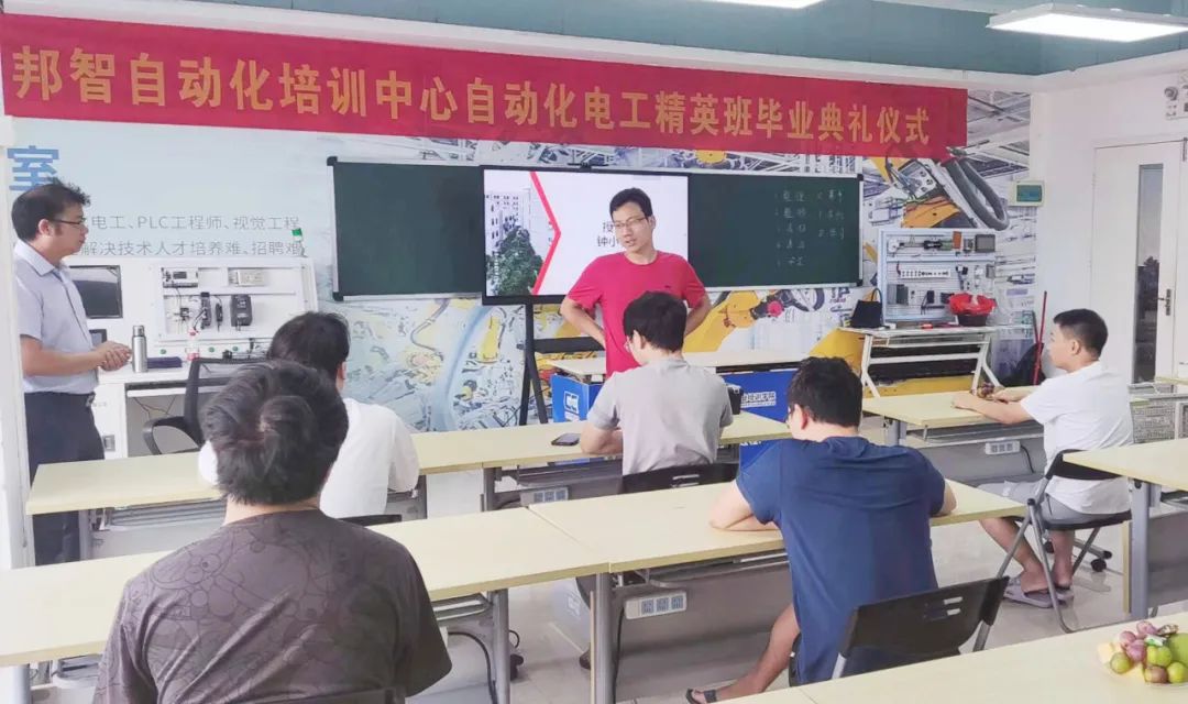 在毕业仪式上,邦智学院总经理秦伟致辞,他表示,今天本期学员毕业,是终点也是起点,希望大家通过这次培训为自己的职业提升开一个好头。他进一步指出电工行业未来的职业方向,就是机电一体化,向自动化、智能化、机器人方向发展。秦总勉励大家要做好职业投资,力求上进,学习更高层次的专业知识。