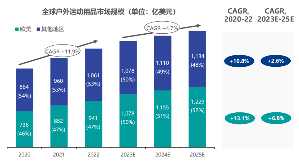 综上,得益于领先全球的消费水平和市场教育度,欧美市场在通胀降温后还将继续引领全球户外市场增长,并进一步扩大其占比。