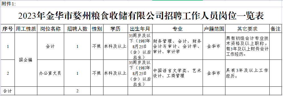本次计划招聘国企编2人,具体招聘岗位、人数和资格条件等详见附件1《2023年金华市婺州粮食收储有限公司公开招聘岗位一览表》。公告提及的附件,可登录下列网站下载查询: