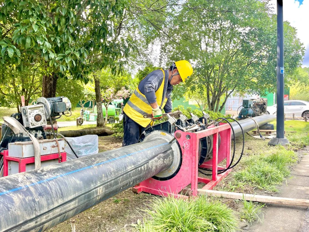 2023年农村生活污水收集管道完善工程(第一批)-高新区、沙家浜镇污水管网工程,工人正在对De315HDPE管热熔焊接。