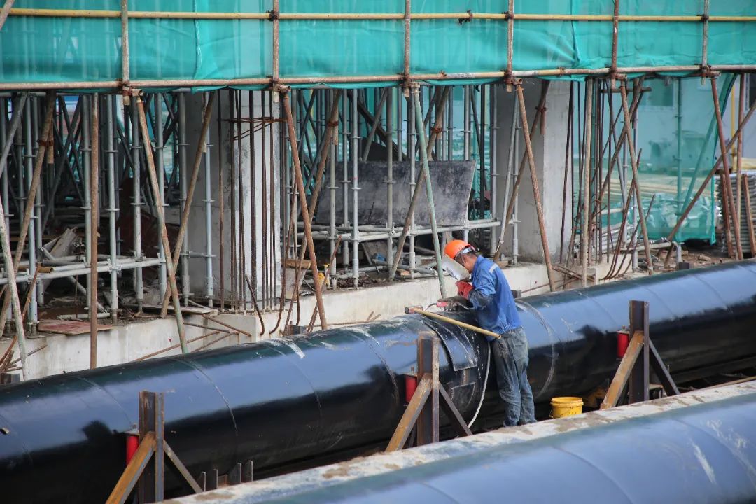 2020年生活污水收集管道完善工程-常福街道柳州路泵站迁建(含配套压力管网)工程,施工人员正在进行穿越望虞河段钢管焊接作业。