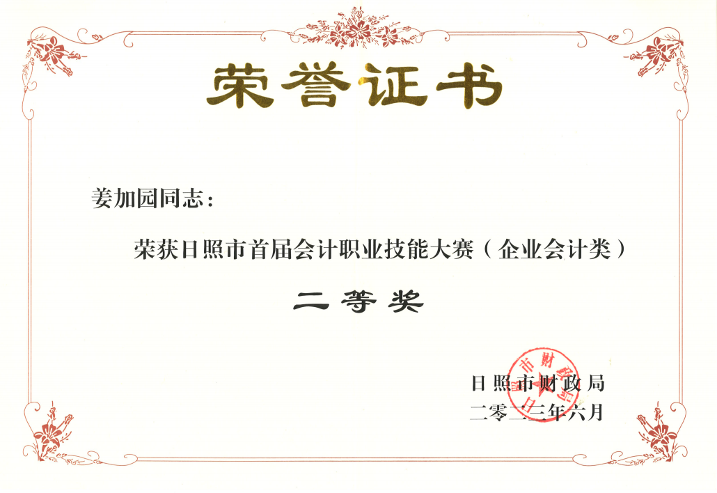 8月9日上午,日照市首届会计职业技能大赛颁奖仪式在日照职业技术学院举行,市财金集团财务与融资部业务主管姜加园获得企业会计类二等奖、全市第10名的优异成绩。