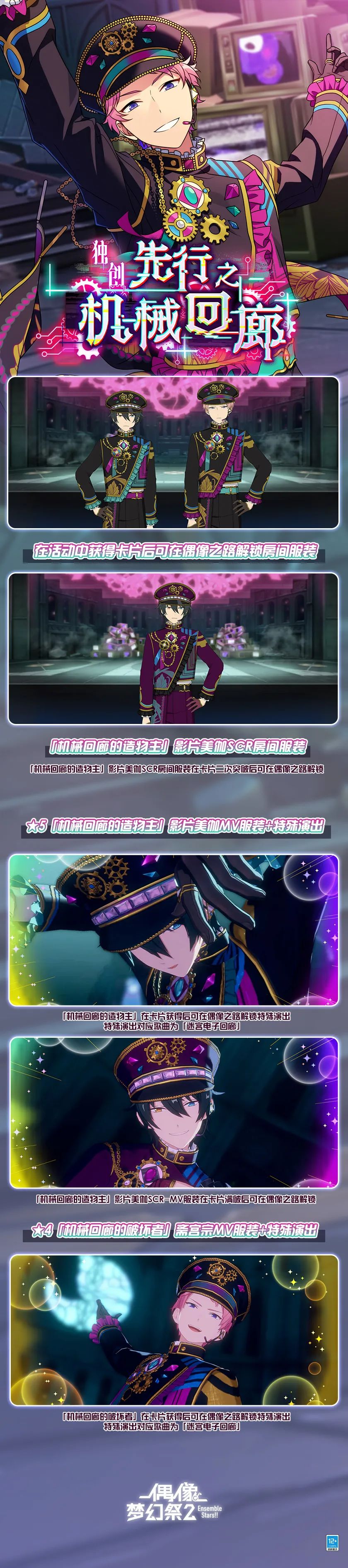 本期活动将开启丝带兑换所。通过演唱会收集「机械回廊丝带」在丝带兑换所中可兑换【钻石】、【活动回忆硬币】、【活动限定服装图纸】、【ES硬币】、【各色宝石】多种道具。