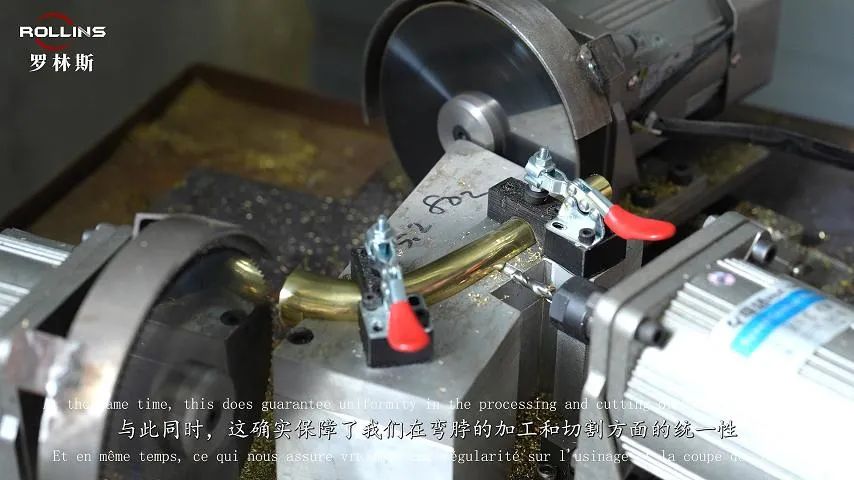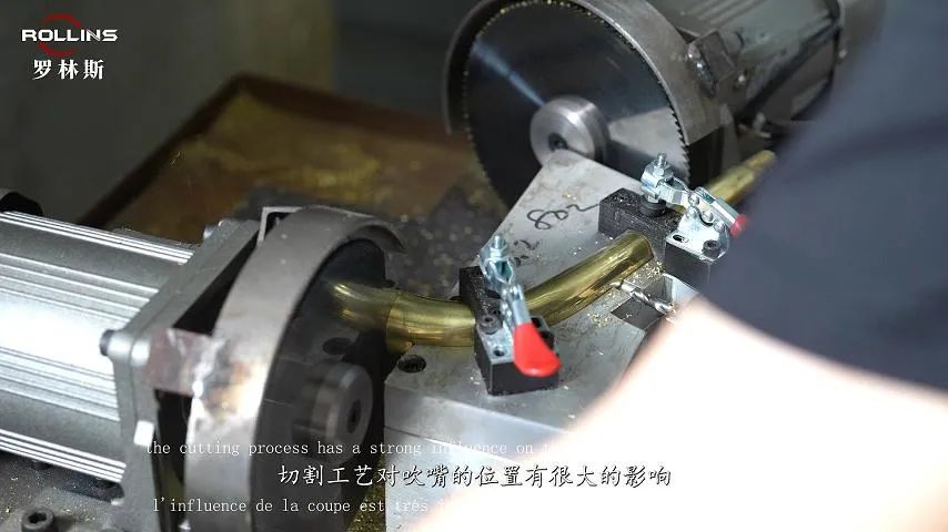 中音和次中音整体部分的弯脖切割工艺,我们采用了极其精准的组装方式。正如你所了解的,切割工艺对吹嘴的位置有很大的影响,因此,我们选用了乐器发声的铝模具,并采用非常刚性的系统切割模具。这个部分为手工操作,但系统非常可靠,我们将按照相同的原理钻吹管。与此同时,这确实保障了我们在弯脖的加工和切割方面的统一性,这样就可以发声了。拉伸后,一旦切割完成,钻吹管步骤就完成了。
