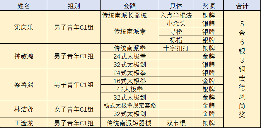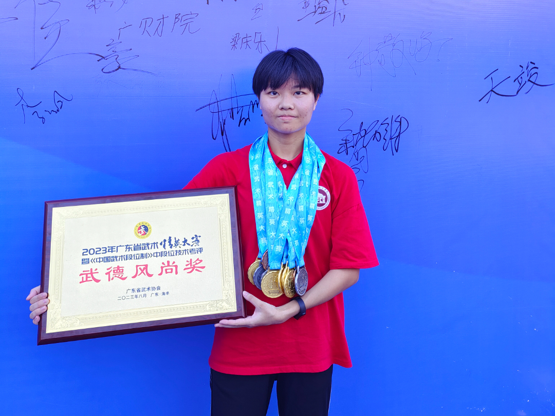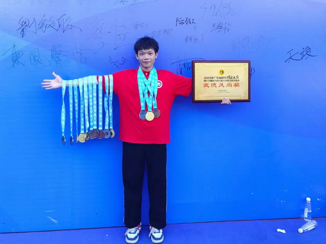 我校武术队在2023广东省武术精英大赛中勇夺奖牌14枚,参赛项目均取得良好战绩——5金6银3铜。两位教练员(时杰、李云凤)获评“优秀教练员”称号。
