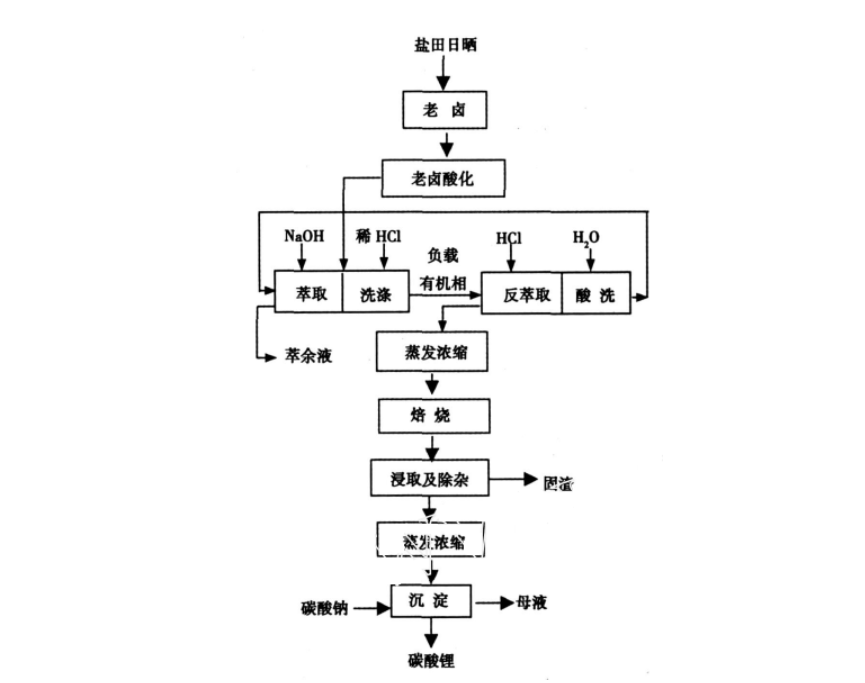 此法最大的优点是适合从高镁锂比盐湖卤水中提取碳酸锂,而且工艺可行;但是在萃取工艺中需要处理的卤水量大、对设备的腐蚀性较大,从而在实施的过程中对设备材质的要求较高。