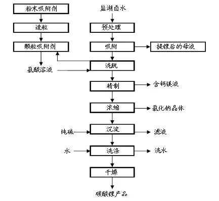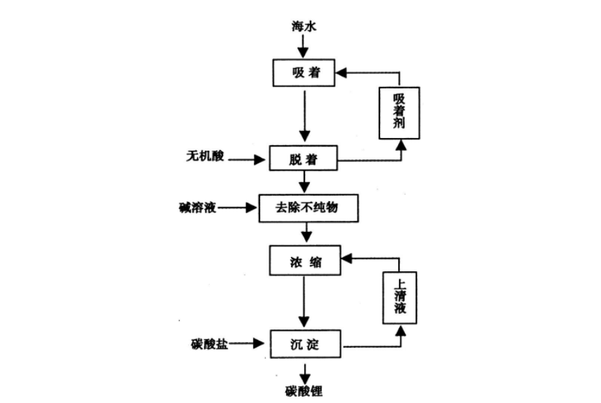 海水中制取碳酸锂,吸附剂法被认为是最有前景的工艺技术,关键是寻求吸附选择性好 、循环利用率高和成本相对较低的吸附剂。其工艺流程图如下: