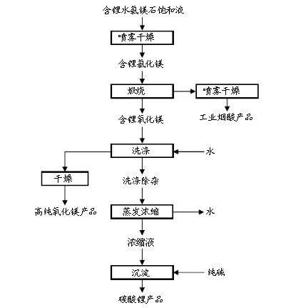 该生产工艺是针对镁锂比较高的盐湖卤水提锂提出的技术。由于MgC12·6H2O 在97~554℃之间脱水,在550℃以上分解成氧化镁和氯化氢气体,在此条件下氯化锂不分解。基于此原理建元等学者在1996年提出并完成小型试验。将煅烧后的烧结物经浸取,锂盐易溶于水则进人溶液,氧化镁几乎不溶于水则留于残渣中,通过浸取工序,并除去浸取液中硫酸根、镁和少量硼等杂质,滤液净化后经蒸发、沉淀烘干就可得到碳酸锂产品。目前建元等以提钾、提硼后的含锂水氯镁石饱和卤水为原料,采用喷雾干燥、煅烧、加水洗涤、蒸发浓缩、加碱沉淀等生产工序,从高镁锂比盐湖卤水中进行镁锂分离,获得了价高优质的碳酸锂、高纯氧化镁和副产品工业盐酸。其工艺流程图如下: