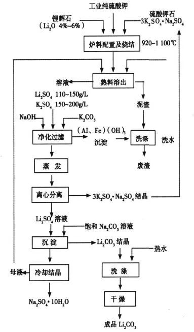 将锂辉石精矿与K2SO4(或CaSO4或两者混合物),在一定温度下混合烧结,经一系列物理、化学反应后,所配人的硫酸盐中的金属元素将矿石中锂置换生成可溶性的硫酸盐,主要杂质则生成难溶于水的化合物,然后将烧结后的熟料浸出分离,锂离子进人溶液,经净化、浓缩、沉淀后得到碳酸锂产品。在处理锂辉石时,先使α-型转换成结构较疏松、易反应的β-型。这种相变实际上是结合在烧结过程中同时进行的。其工艺流程如下: