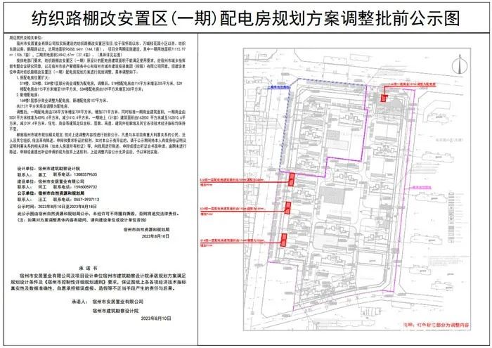 按供电部门要求,纺织路棚改安置区(一期)原设计的配电房建筑面积不能满足使用要求,经宿州市城乡指挥部专题会议研究同意,以及宿州市房产管理服务中心和宿州市城市建设投资集团(控股)有限公司同意,现建设单位申请对纺织路棚改安置区(一期)配电房规划方案进行规划调整,具体调整如下: