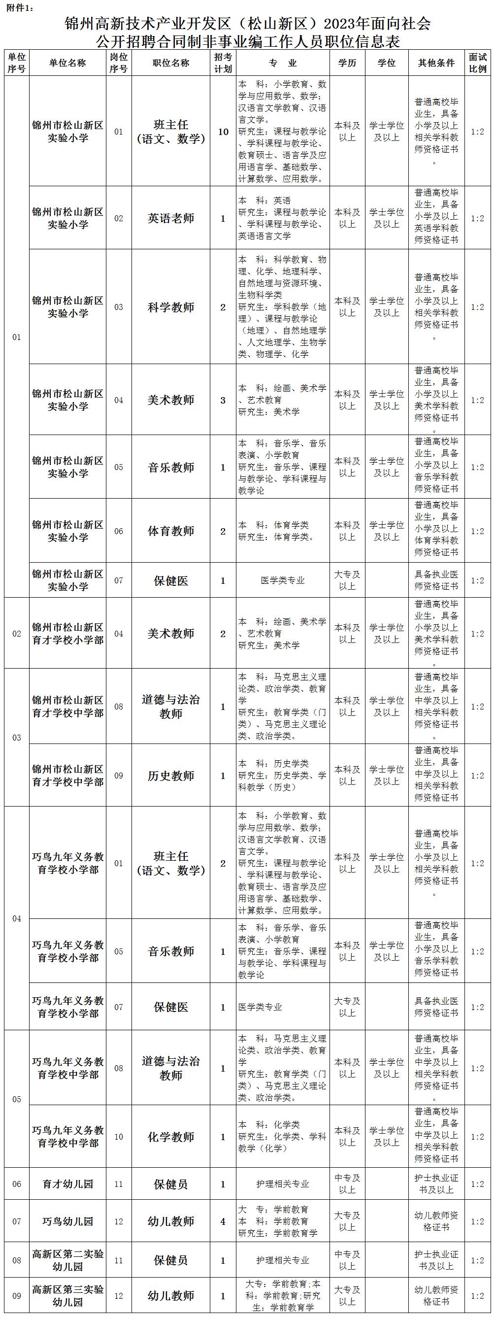 招聘区属中小学、幼儿园合同制非事业编工作人员37人,职位不得兼报。具体岗位详见《锦州高新技术产业开发区(松山新区)2023年面向社会公开招聘合同制非事业编工作人员职位信息表》(附件1)(见文中最下方)。