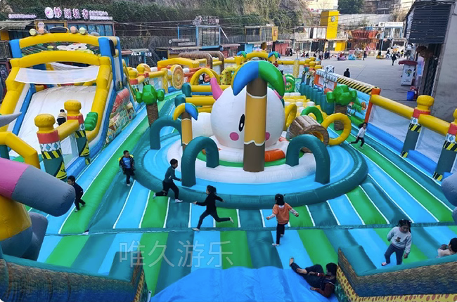 1. 充气城堡:充气城堡作为室外游乐设备之一,体积较大,可以供多个孩子同时玩耍,可以满足孩子们爬上爬下、跳跃、攀爬等的天性,增进孩子们的体能和体验感。此外,充气城堡的安全性能也比较高,能够降低孩子在游玩过程中受伤的几率。