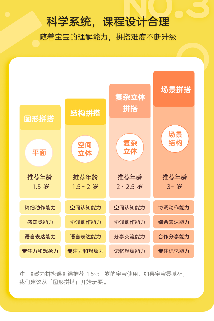 这套课程里,有一整套的磁力拼搭玩具,适合 1~6 岁的宝宝玩。玩具和线下早教班的是同款,里面的配件超级丰富。
