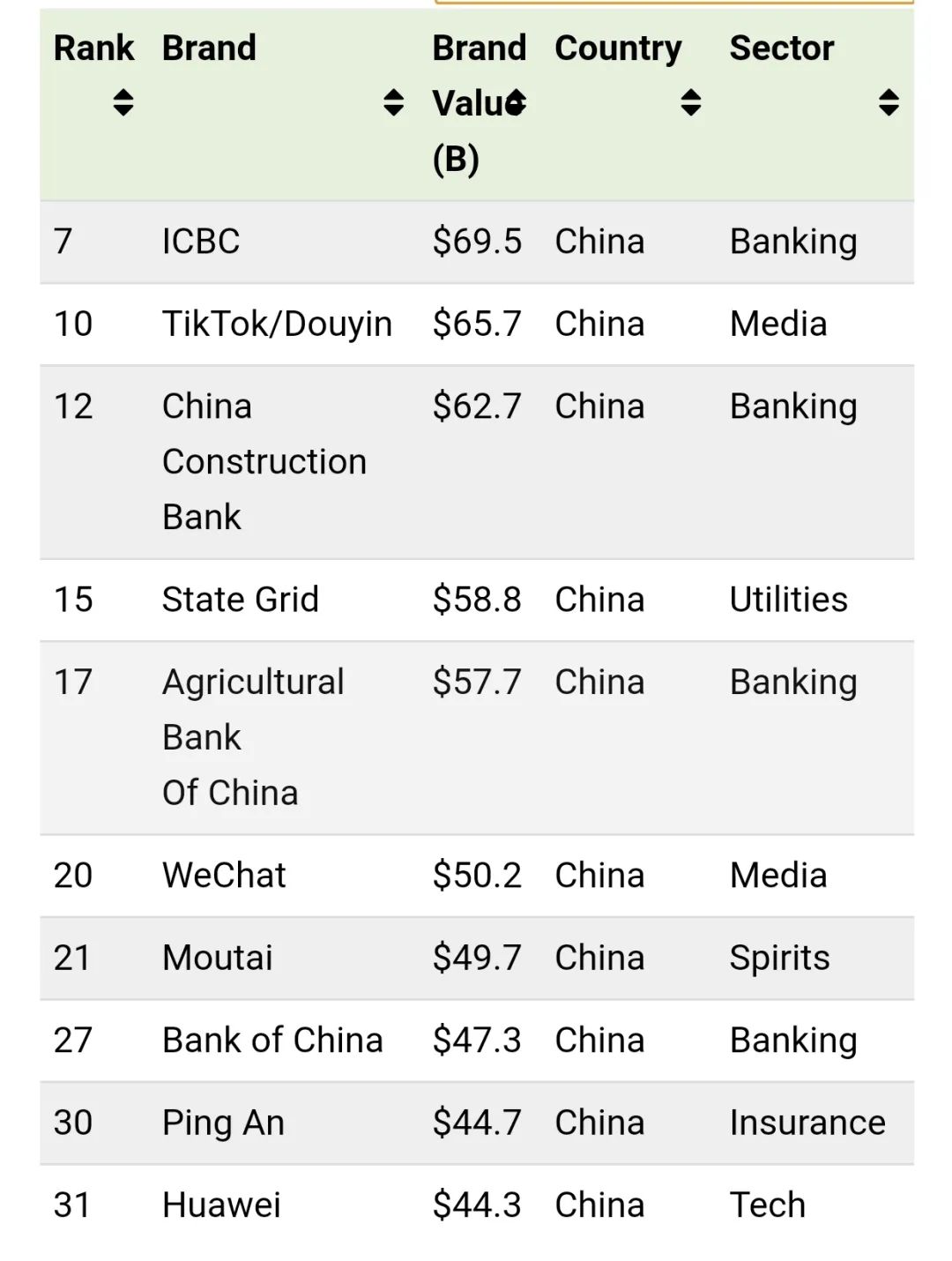 Brand Finance的排名基于对全球数万个品牌价值的计算和分析,其中,品牌价值的计算方法是:品牌强度指数x品牌使用费率x品牌收入=品牌价值。品牌强度指数综合评估品牌投资、品牌资产和品牌表现;品牌使用费率根据所在行业确定;品牌收入根据归属于该品牌的母公司收入计算。最终品牌价值需贴现至净现值。