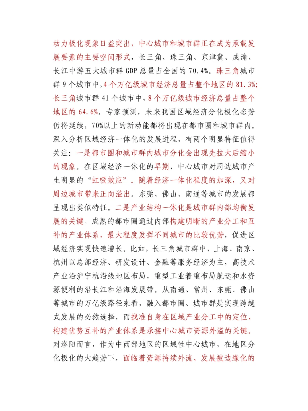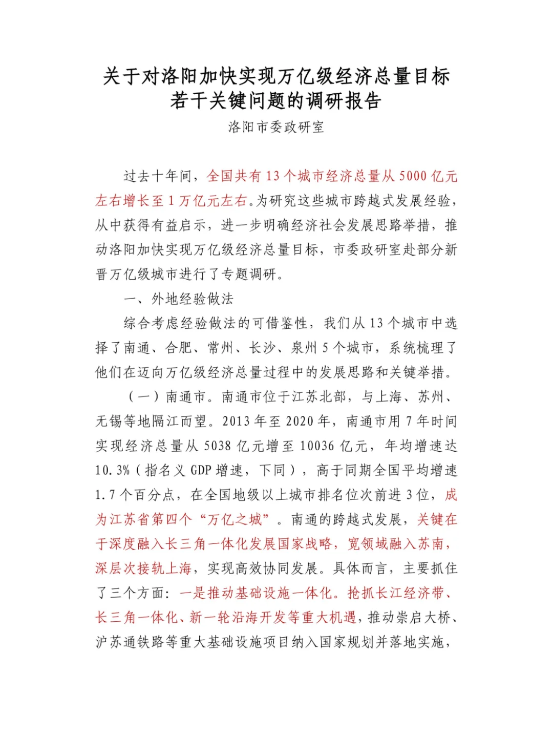 报告详实分析了南通、合肥、常州、长沙、泉州等五个城市进入\"万亿之城\"的经验,挖掘出洛阳市实现万亿级经济总量目标需要把握的关键问题,并给出详实可行的工作建议,限于篇幅先放了上半部分以供学习借鉴。