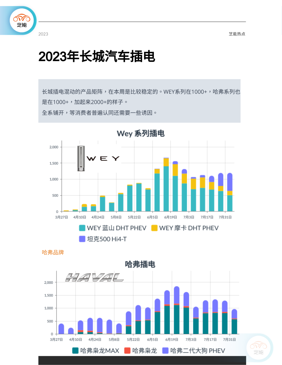 插电混动系列: 长城的混动产品销售稳定,其中WEY系列和哈弗系列各销售1000+辆。