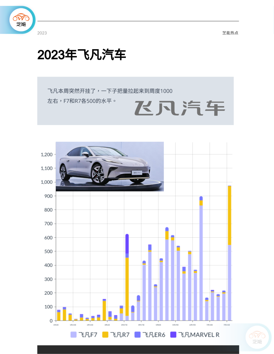 飞凡汽车本周销售表现出色,销量一跃达到周度1000辆,其中F7和R7各自销售了500辆。