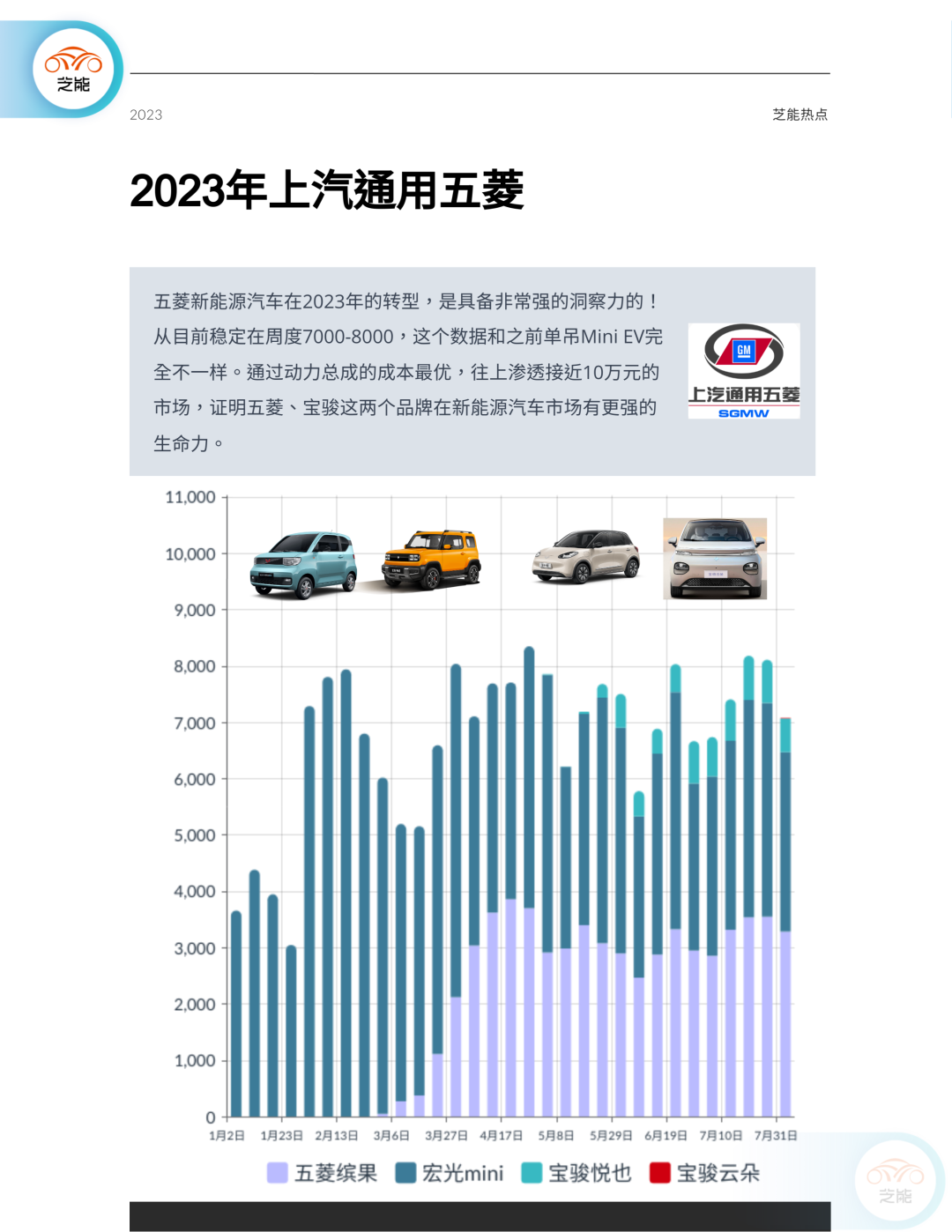 五菱新能源在2023年进行了成功的转型,具备前瞻性的战略眼光。当前的销售数据维持在周度7000-8000辆,显示出该品牌在新能源汽车领域的生命力。