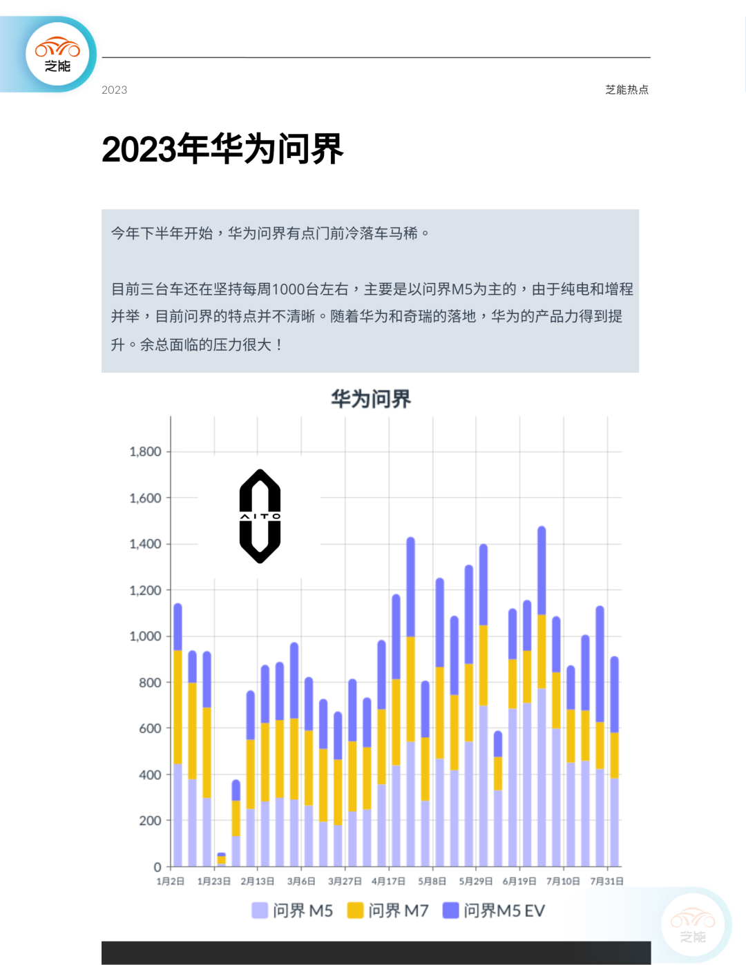 华为问界近期表现略显低迷,但仍然维持每周1000辆的销售量。随着华为与奇瑞的合作,产品力量预计会有所增强。
