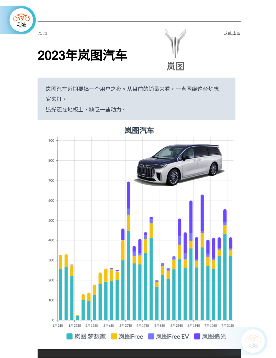 岚图汽车近期将举办用户之夜活动,目前的销售主要集中在“梦想家”车型,而其他车型销量相对较低。