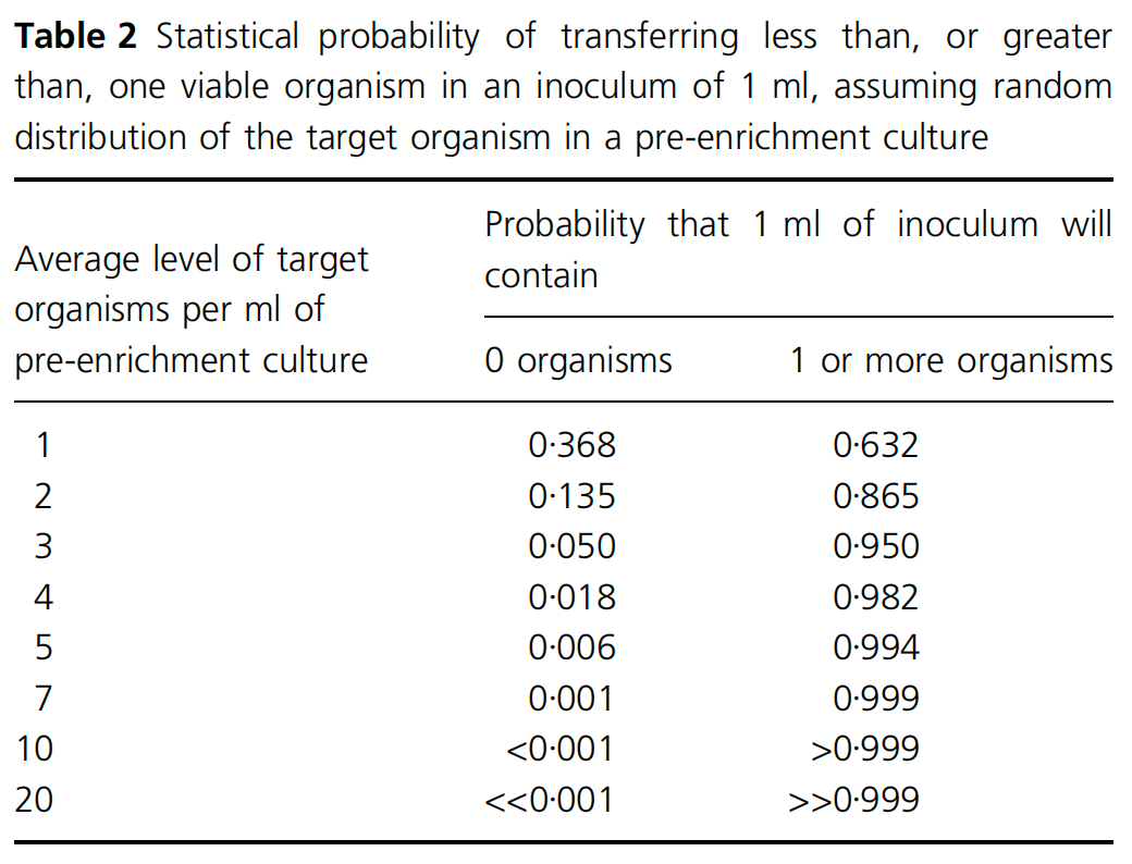 为了确保在1ml预增菌培养物中至少可被转移1个目标菌,要求1ml培养物中至少平均存在7个活菌。类似的考虑也适用于将目标菌从增菌培养转移到分离琼脂平板。如下表所示。