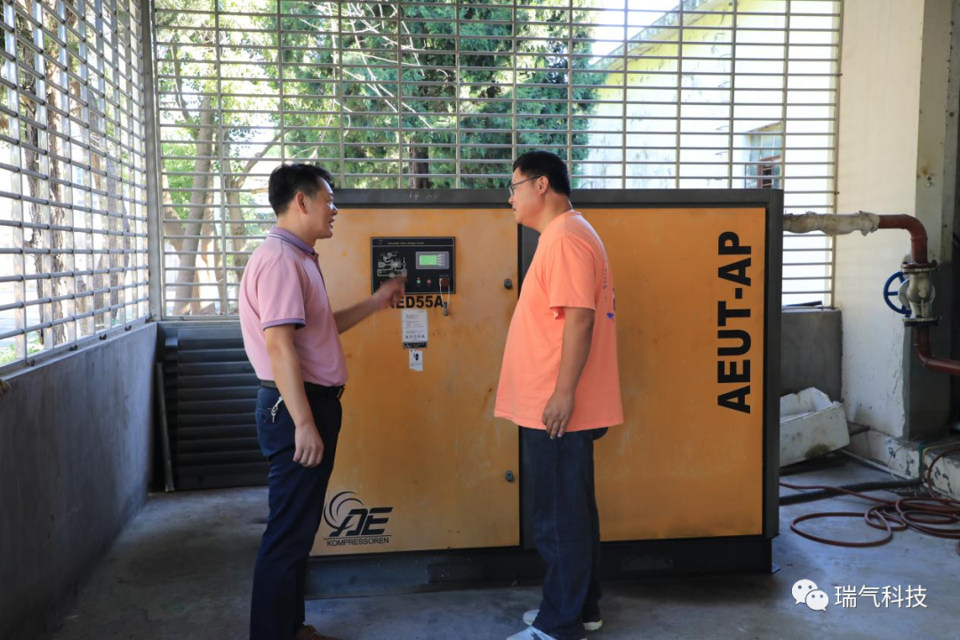 在空压机房,李军总经理和该企业负责人及设备负责人一起对厂区的空压机系统的使用、噪音、能耗、保养等数据进行了研判和分析。李军总经理通过数据分析,初步给出了一套节能改造相关方案,得到了该企业负责人的认同。双方约定,瑞气科技将排除技术人员和该企业一起对厂区的节能改造方案进行细化,并尽快执行。