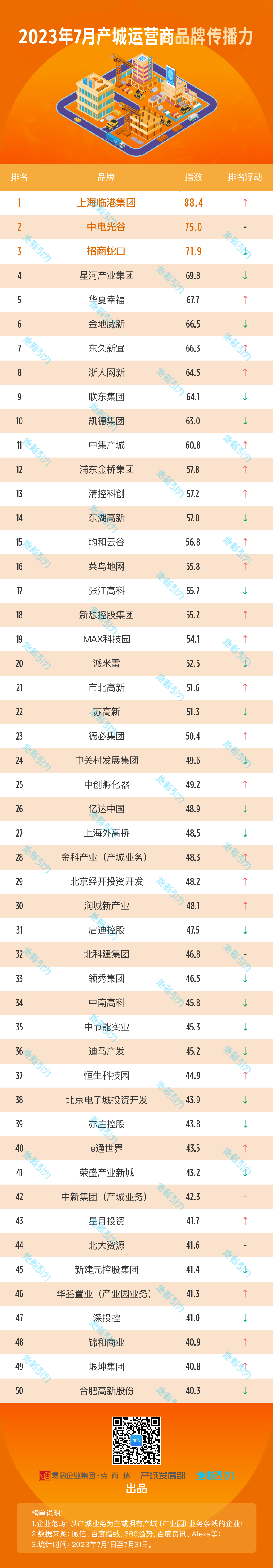 克而瑞2023年7月产城运营商品牌传播力正式发布。传播力前3名分别为上海临港集团、中电光谷、招商蛇口。