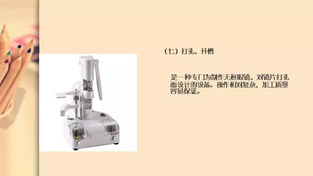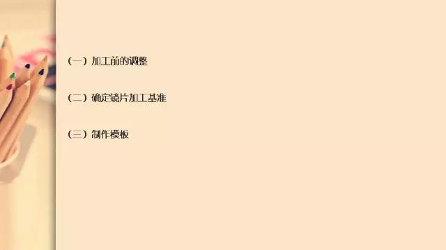 大家下午好,今天我们来一起来讲解无框眼镜加工的步骤包括:加工前的调整——确定镜片加工基准——制作模板——定中心——磨边——磨安全角——抛光——打孔、开槽——装配——加工后的调整(整形)——检测