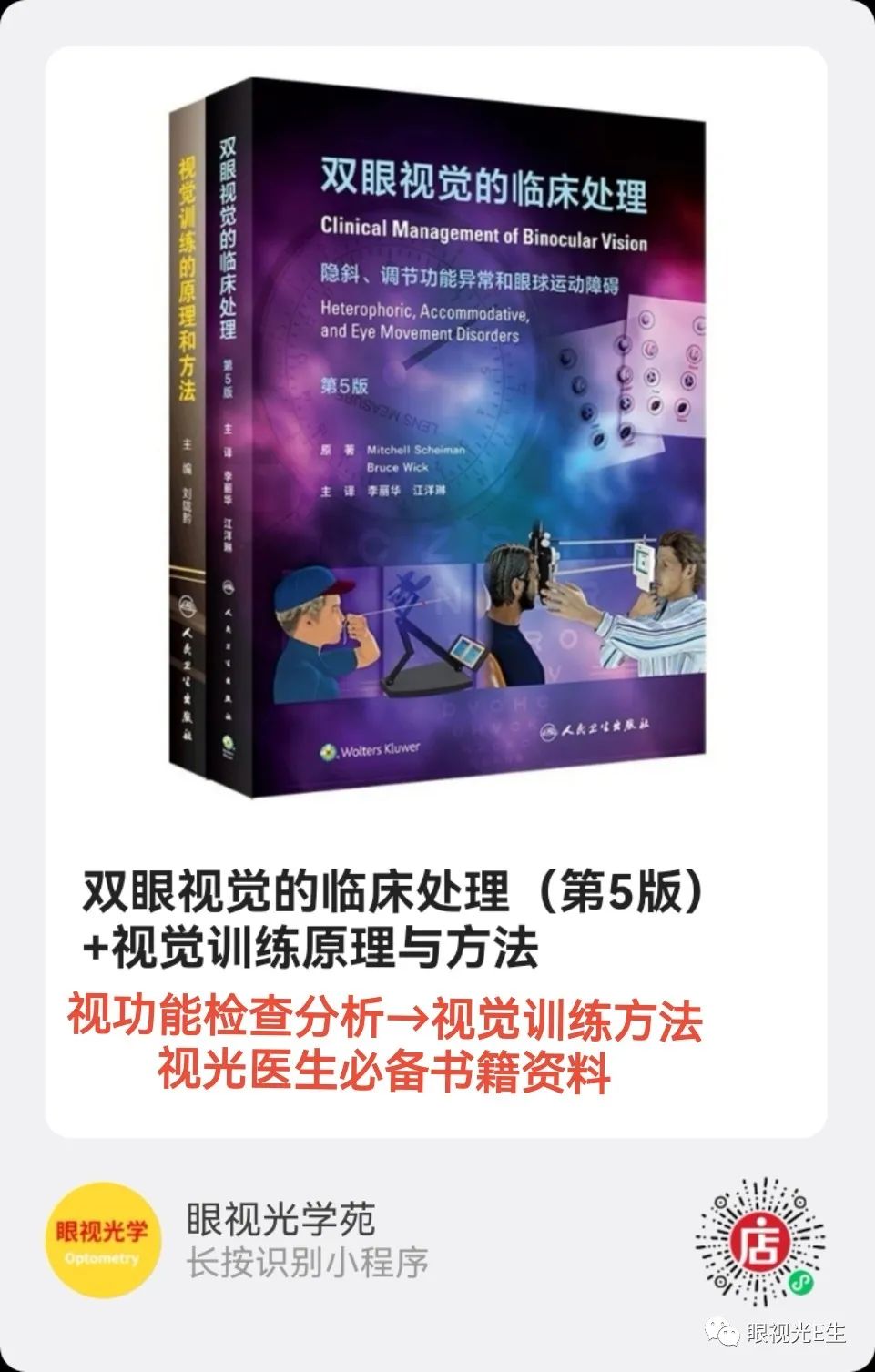 本书从视觉训练最初发展起笔,详细阐述视觉训练的生理和神经基础,以及学科发展中逐渐丰满的各项分类与康复范畴。各章节按照视觉训练分类详细阐述,整体条理清晰,从而试图使初学者易于学习和掌握。视觉训练相关观点定义清晰,无甚赘述,帮助各位读者答疑解惑并予以牢记运用。全书以视觉训练原理为导向,详尽阐明各种视觉康复针对性的方法,有一定的科学性与严谨性,为视光学和视觉康复工作者的临床实践打下坚实的知识基础。