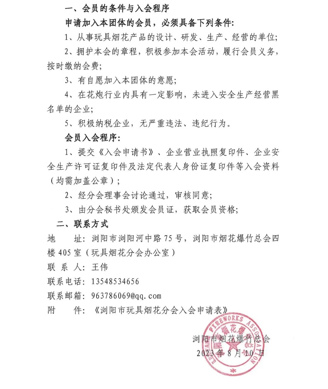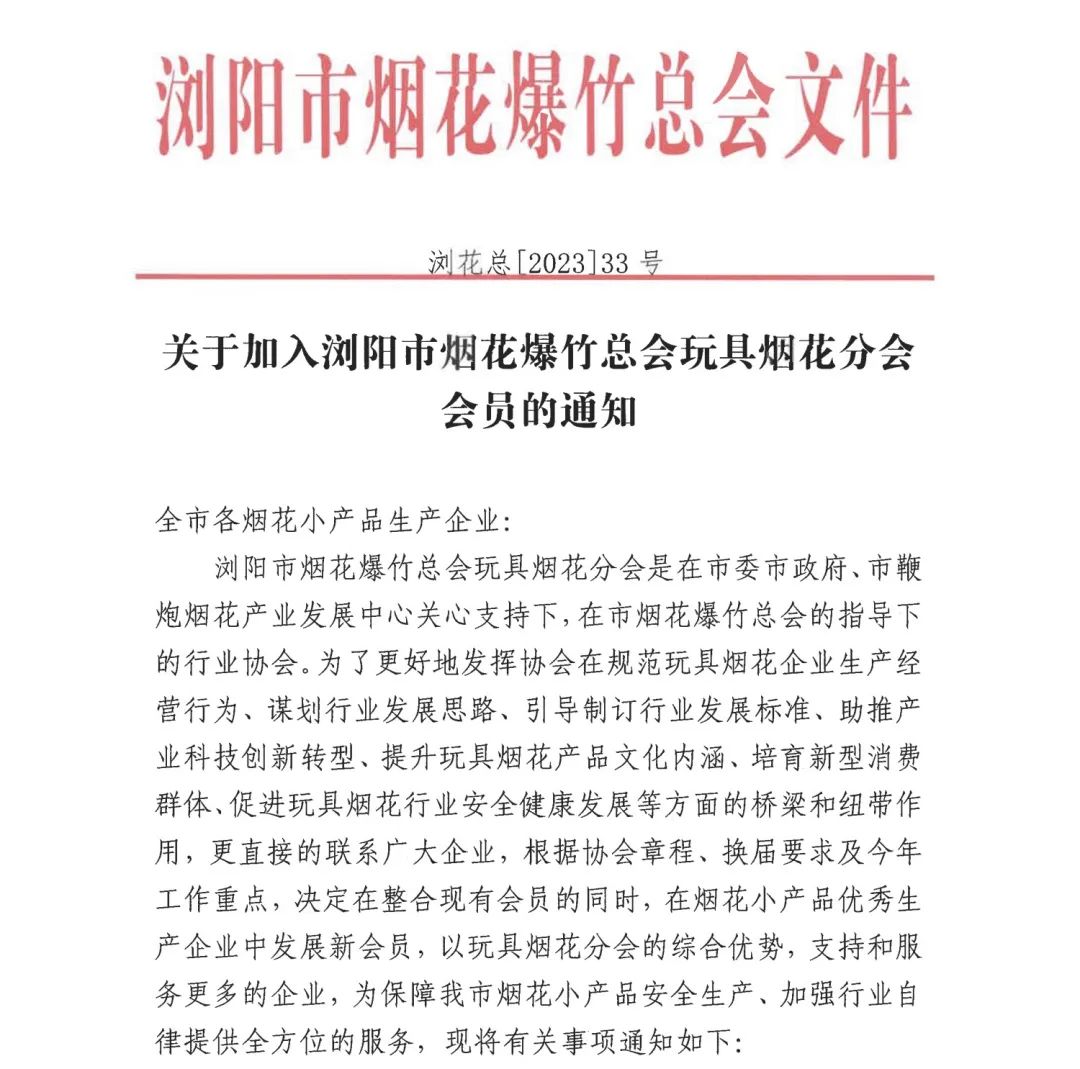 关于加入浏阳市烟花爆竹总会玩具烟花分会会员的通知