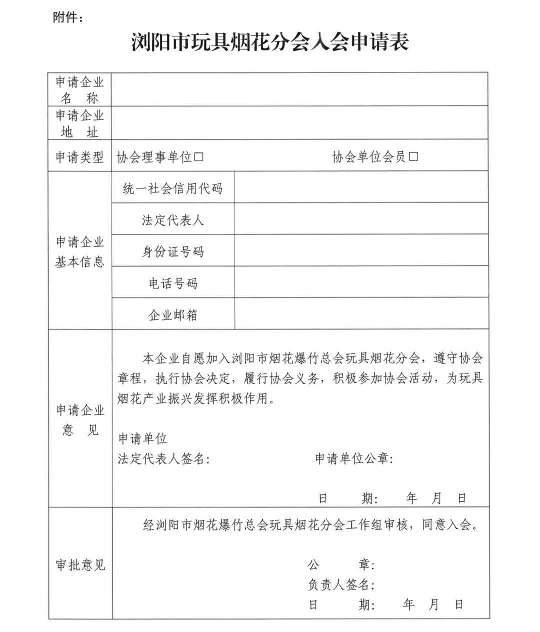 申请表下载地址:浏阳市玩具烟花分会入会申请表