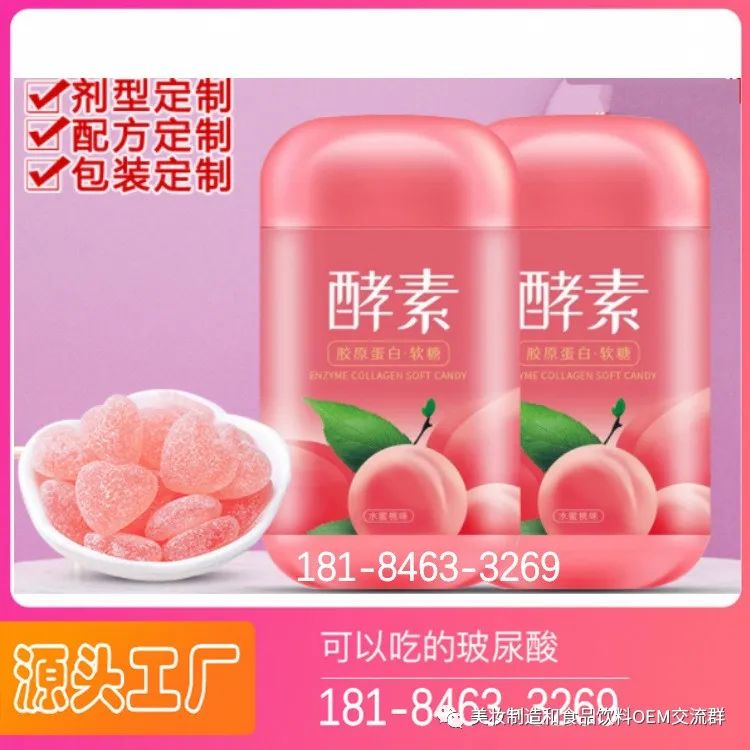 酵素胶原蛋白软糖代加工,胶原三肽透明质酸钠弹性蛋白软糖OEM,益生菌酵素蓝莓胶原蛋白肽软糖代加工,酸枣仁GABA氨基丁酸软糖加工,白芸豆绿咖啡血橙软糖加工,我们按客户需求订做不同配方产品,专业提供策划、设计、包材、配方、生产、送货一站式OEM贴牌定制服务。