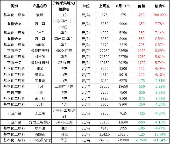 在卓创资讯监测的111个产品之中,本周期有60个产品上涨,占比54.05%;16个产品持稳,占比14.41%;35个产品下降,占比31.54%。上涨的前三名产品为液氯、丙二醇、DMF,涨幅分别为200.00%、7.78%、7.14%;下跌的前三名产品为工业级碳酸锂、硫酸铵、燃料油,跌幅分别为11.34%、10.94%、4.47%。